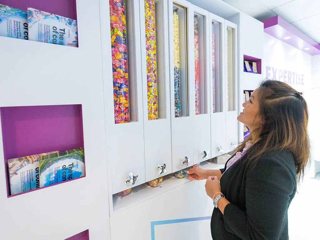 The perfect stand design to attract and retain delegate attention. The dart contest was staged inside a protective glass box to allow for visitor and player safety but with maximum viewing for the delegates. Our stand design team also incorporated a novel pick ‘n’ mix wall using large vending tubes that sat alongside a promotional item showcase. The unusual sweet giveaways drove more visitors to the stand and helped to increase dwell time even further.